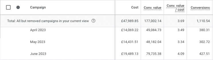 I launched the campaign which saw strong initial conversions. I then segmented the winning categories and scaled the campaigns using Target ROAS bidding, protecting spend and maintaining performance.