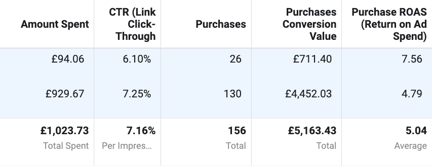 I was able to use the client’s healthy email database to create a lookalike audience to target, which provided strong results from the start. As the Facebook Pixel gained more data, I was then able to create and test other useful lookalike audiences (e.g. high value purchasers).